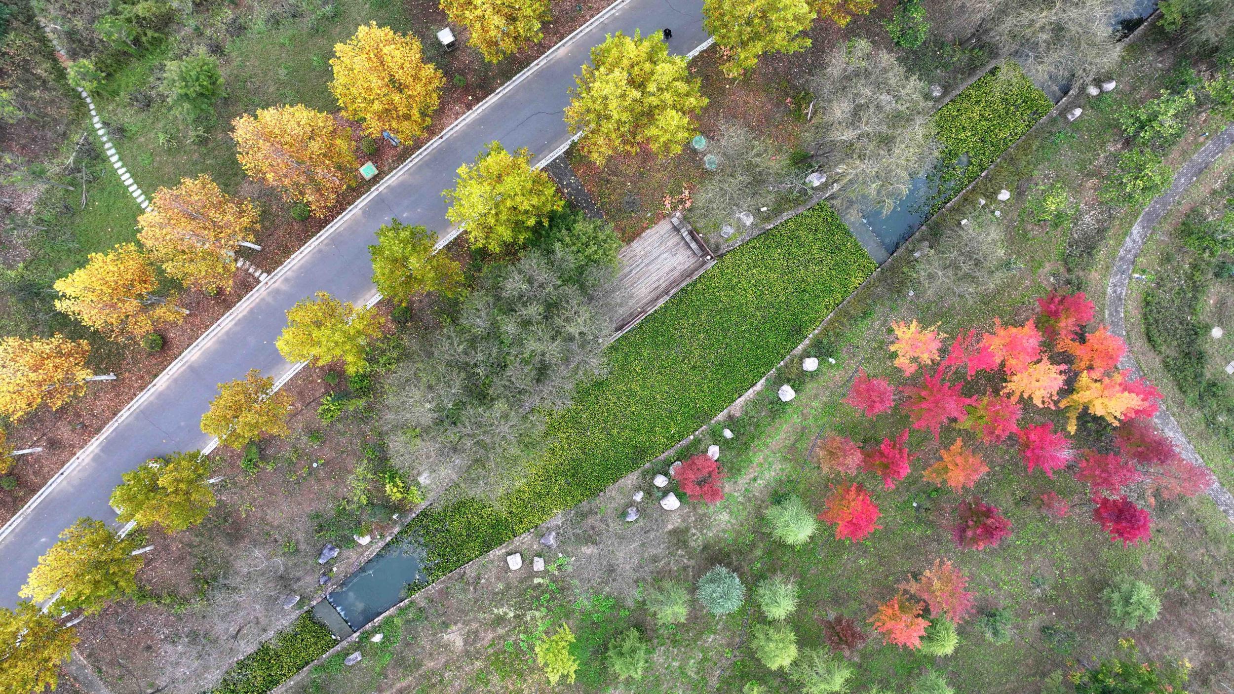 10月22日,走进洛阳市孟津区龙泉谷公园,秋日的绚烂扑面而来。抬眼望去,枫叶燃红、银杏铺金、松柏凝翠,各类植被褪去盛夏的葱郁,换上五彩斑斓的盛装;俯瞰河道,蜿蜒的碧水如丝带穿林而过,倒映着两岸层林尽染的秋色,红黄蓝绿交相辉映,恰似大自然不慎打翻了调色盘,将一幅层次丰盈、意境悠远的秋日画卷在天地间徐徐铺展。