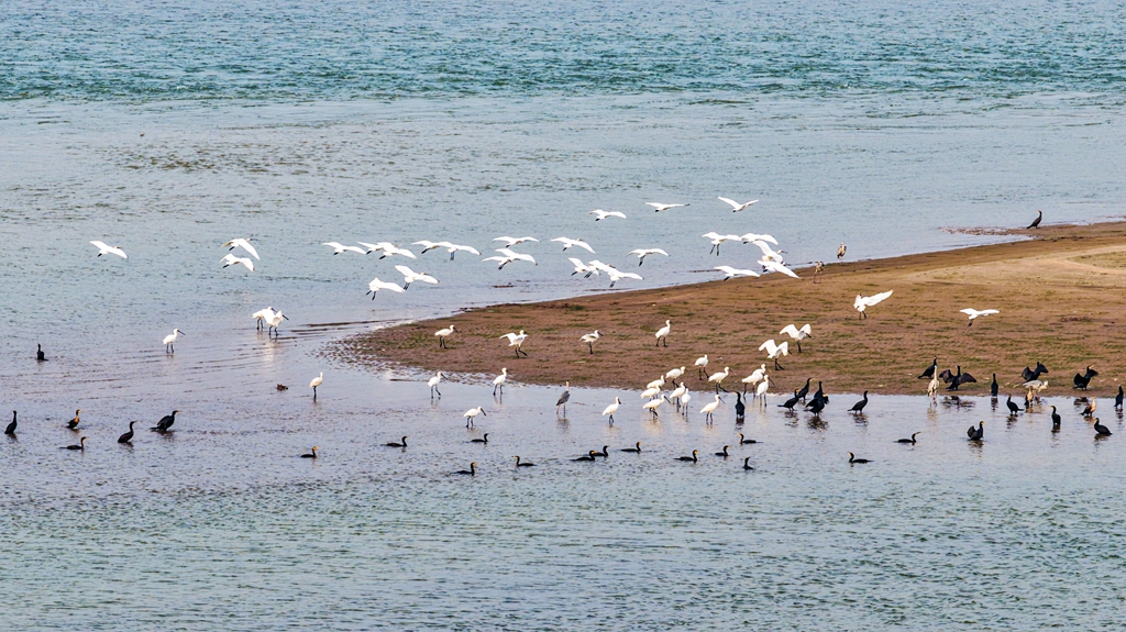 在黄河会盟段的一处夹心滩上聚集白琵鹭、鸬鹚、白鹭、豆雁等迁徙鸟类,尤其是鸬鹚种群庞大,成群连片,铺展出一幅万鸟翔集的生态画卷。