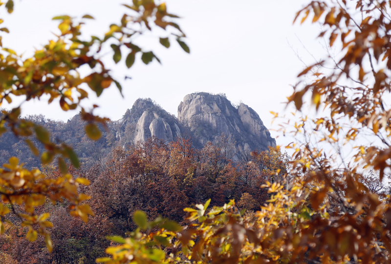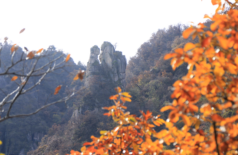 2025年11月1日,汝阳县付店镇西泰山风景区情侣峰,满山红叶,层林浸染。