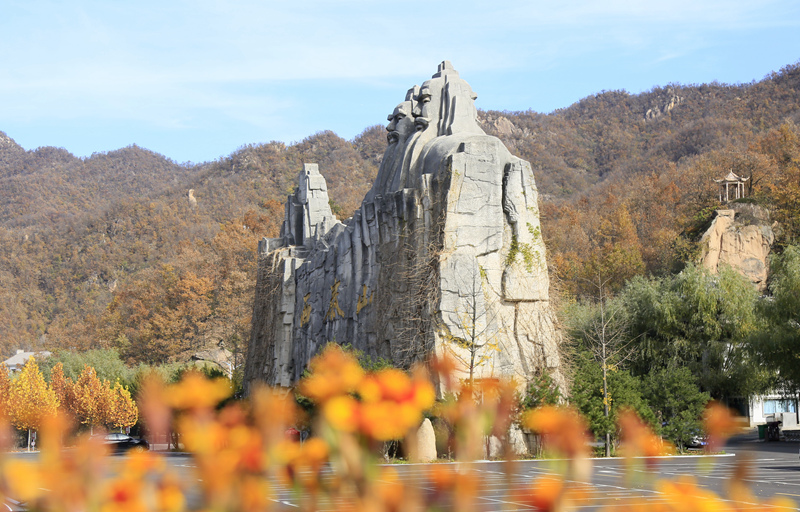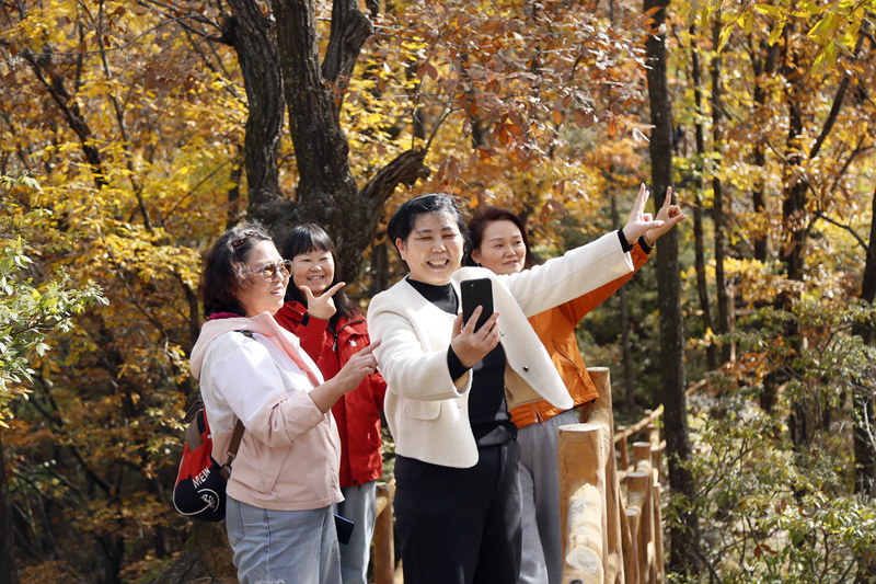 2025年11月1日,在五彩斑斓汝阳县付店镇西泰山风景区,游客在赏景拍照。