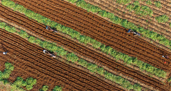 11月4日,在汝阳县刘店镇万亩红薯大方,看到宛如一幅徐徐展开的巨幅油画,人们正在割红薯秧子,加紧挖地里的红薯,一片繁忙的景象。