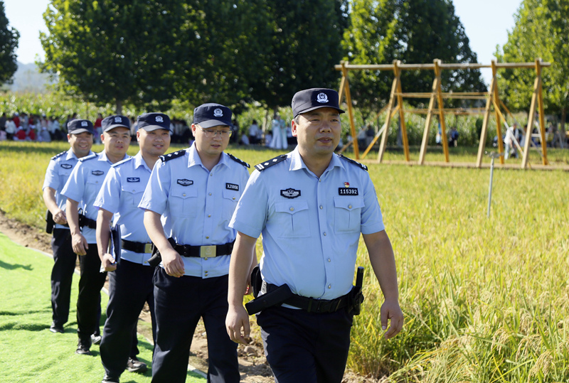 汝阳县公安局三屯派出所民辅警在稻田小镇巡逻执勤。