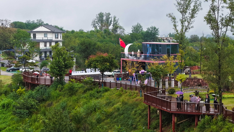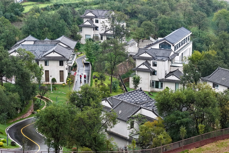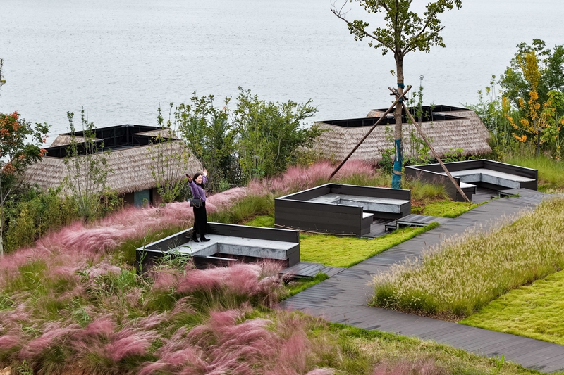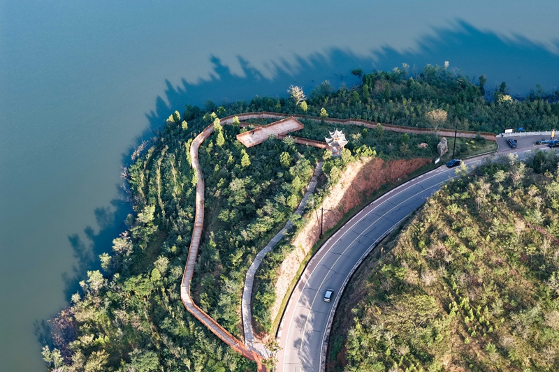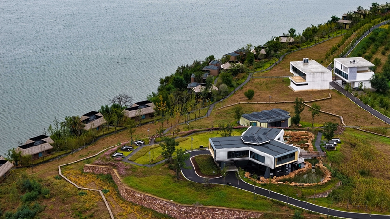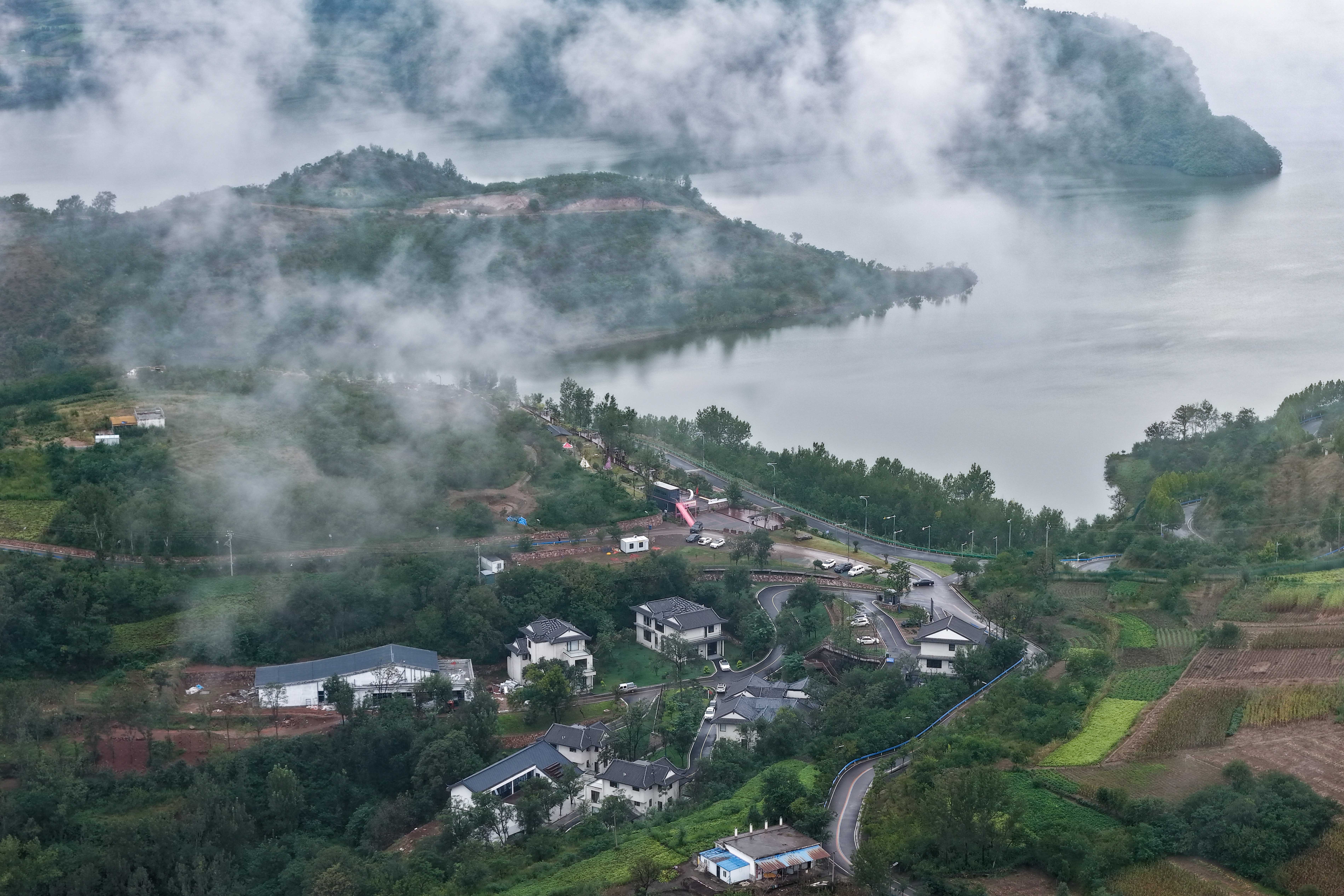10月13日,持久的连阴雨过后,河南汝阳县云梦湖畔天空湛蓝,白云朵朵,湖水清澈如镜,倒映着群山与晴空。微风拂过,湖面泛起粼粼波光,岸边的绿树、建筑物与远处的青山相映成趣,构成一幅清新秀美的生态画卷。