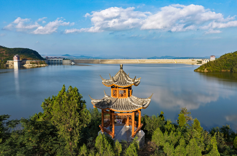 10月13日,持久的连阴雨过后,河南汝阳县云梦湖畔天空湛蓝,白云朵朵,湖水清澈如镜,倒映着群山与晴空。