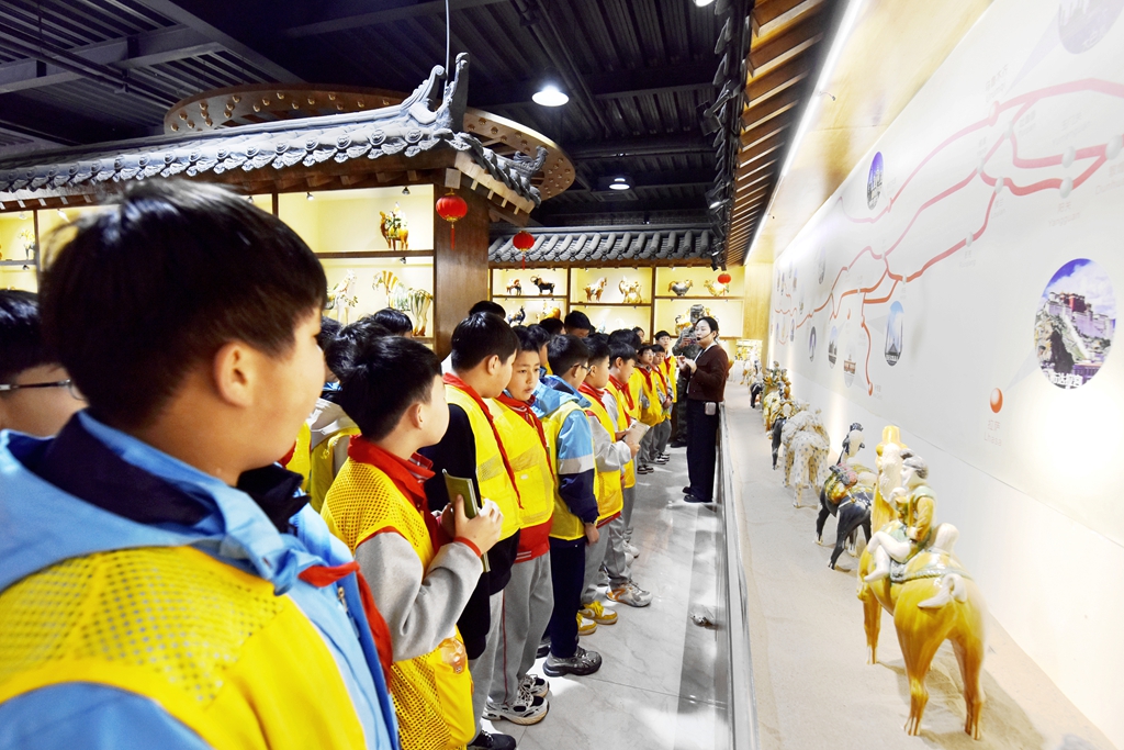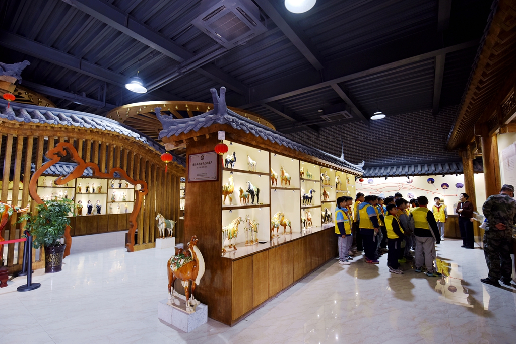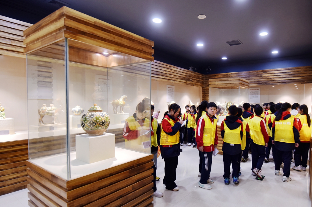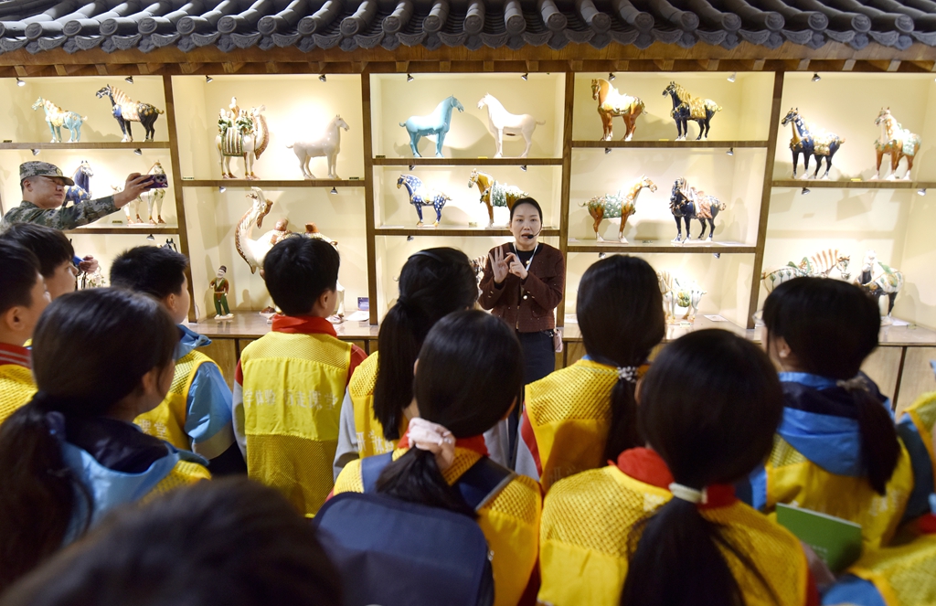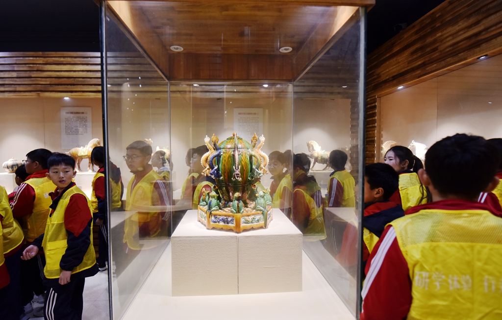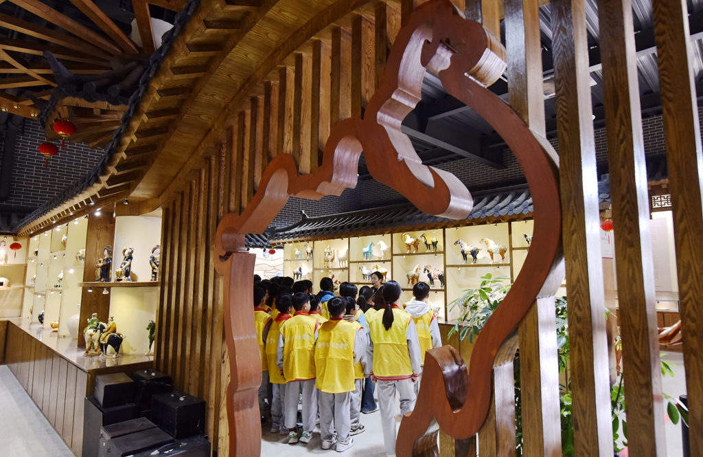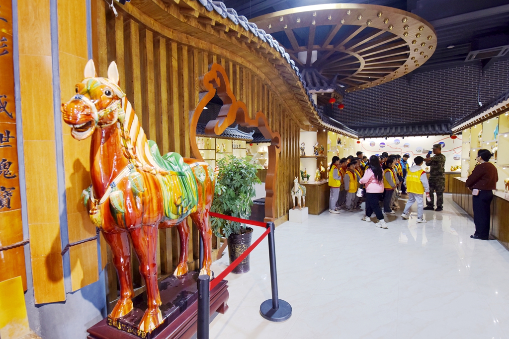 10月24日,在洛阳市孟津区朝阳镇南石山村的洛阳九朝文物复制品有限公司高家三彩博物馆研学基地内,来自嵩县江苏双语学校的200多名学生正在开展研学活动,近距离欣赏精美的仿古唐三彩产品,尽情感受唐三彩这门古老艺术的神奇魅力。眼下在朝阳镇南石山村大大小小的唐三彩制作基地,挤满了来自国内外来研学的学生和孩子们,研学场景十分火爆。